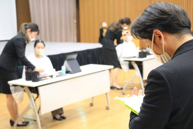 ビューティーアドバイザー(美容部員)として店頭に立つために必要な「コミュニケーション力」をはじめ、【①第一印象②表情③身嗜み④声の聞きやすさ】の4つの項目で審査して頂きました。