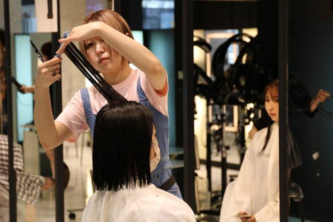 検定では、学生たちが時間内にカット&カラーの施術を行いながら、お客様とのコミュケーションも審査されます。この試験は、技術だけでなく、お客様に対する心遣いやプロとしての対応力も評価される実践的なものです。