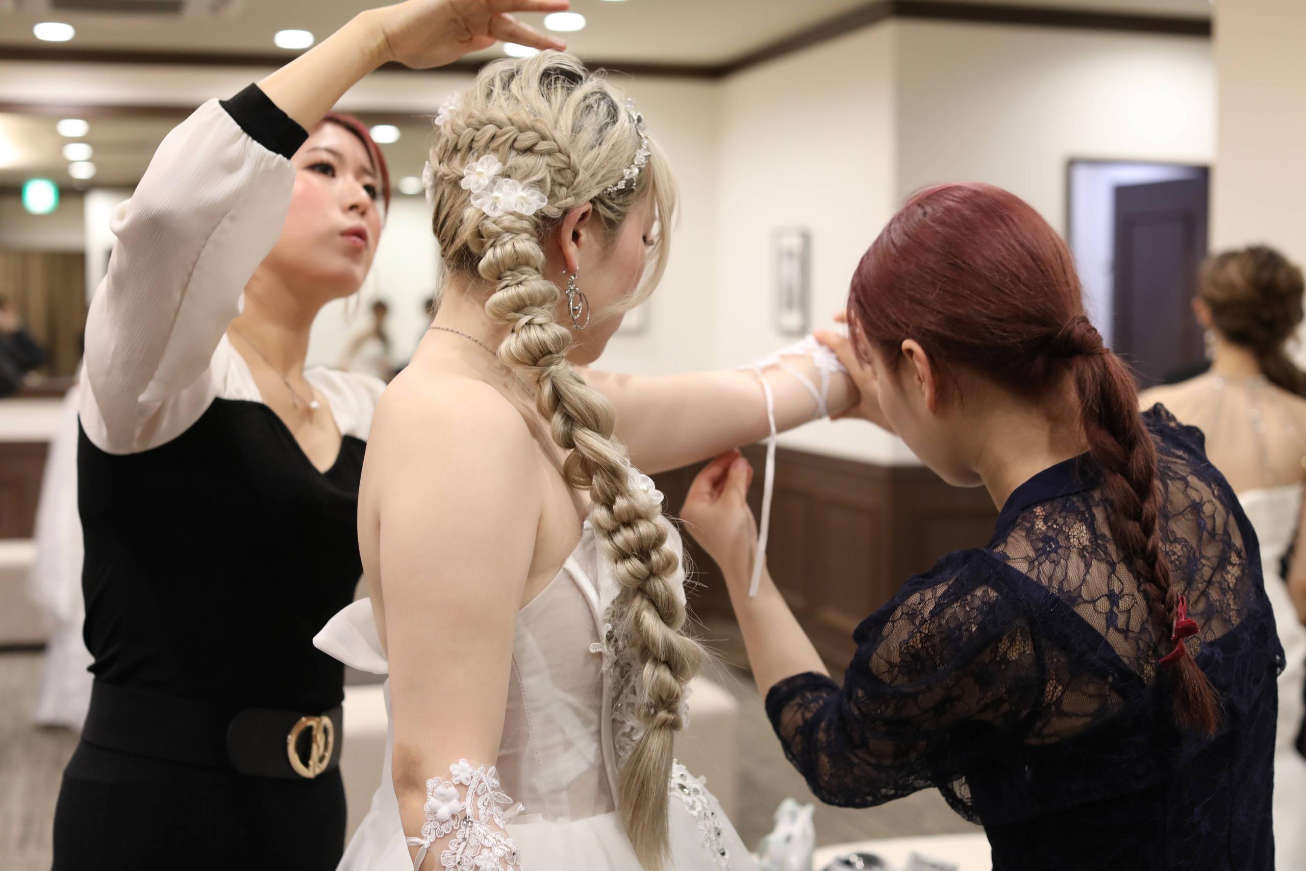 ドレスや会場の雰囲気に合わせて、学生それぞれがヘアアレンジ・メイク・アクセサリーのトータルコーディネートを企画。