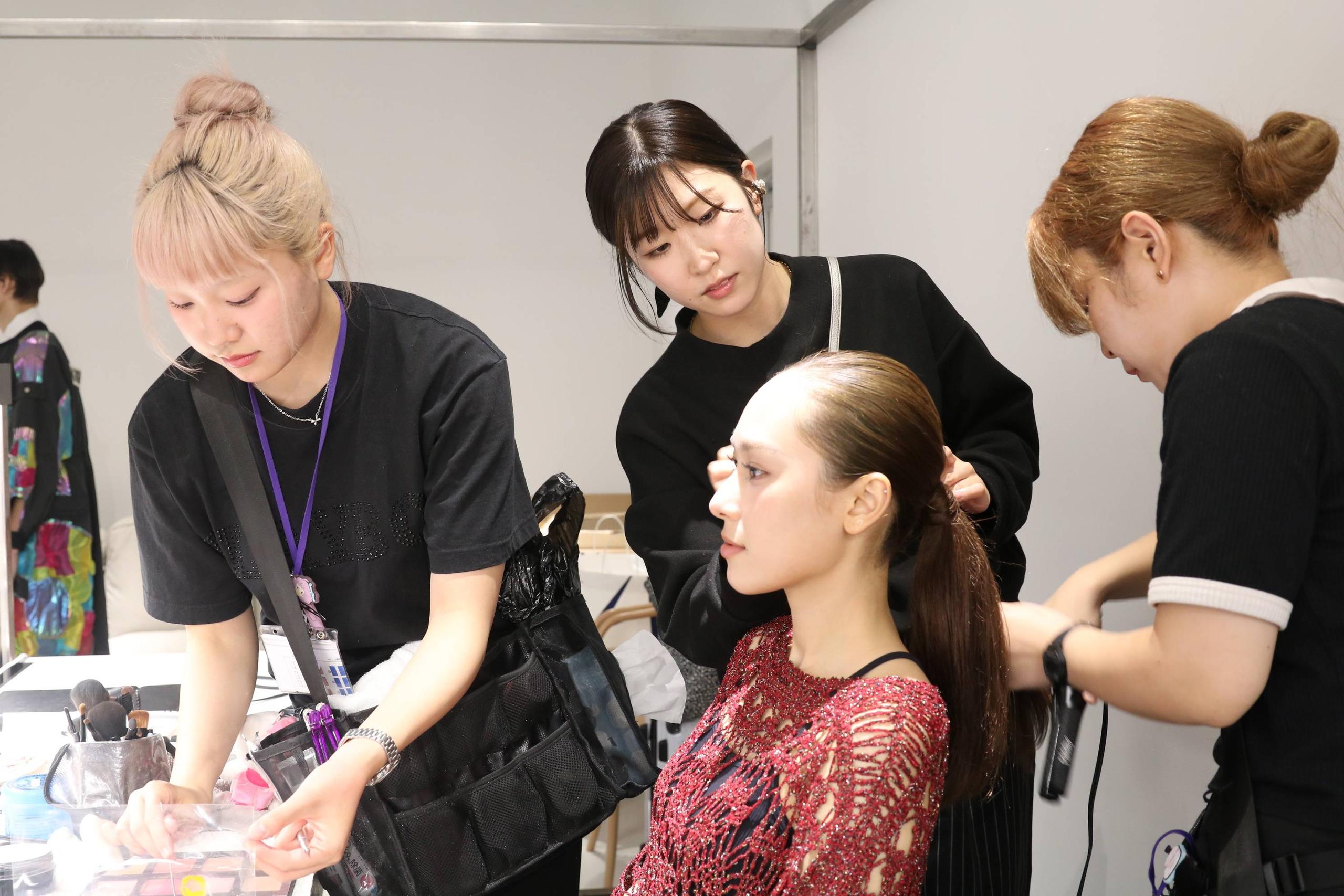 実際にモデルを相手に、ヘアもメイクも担当。