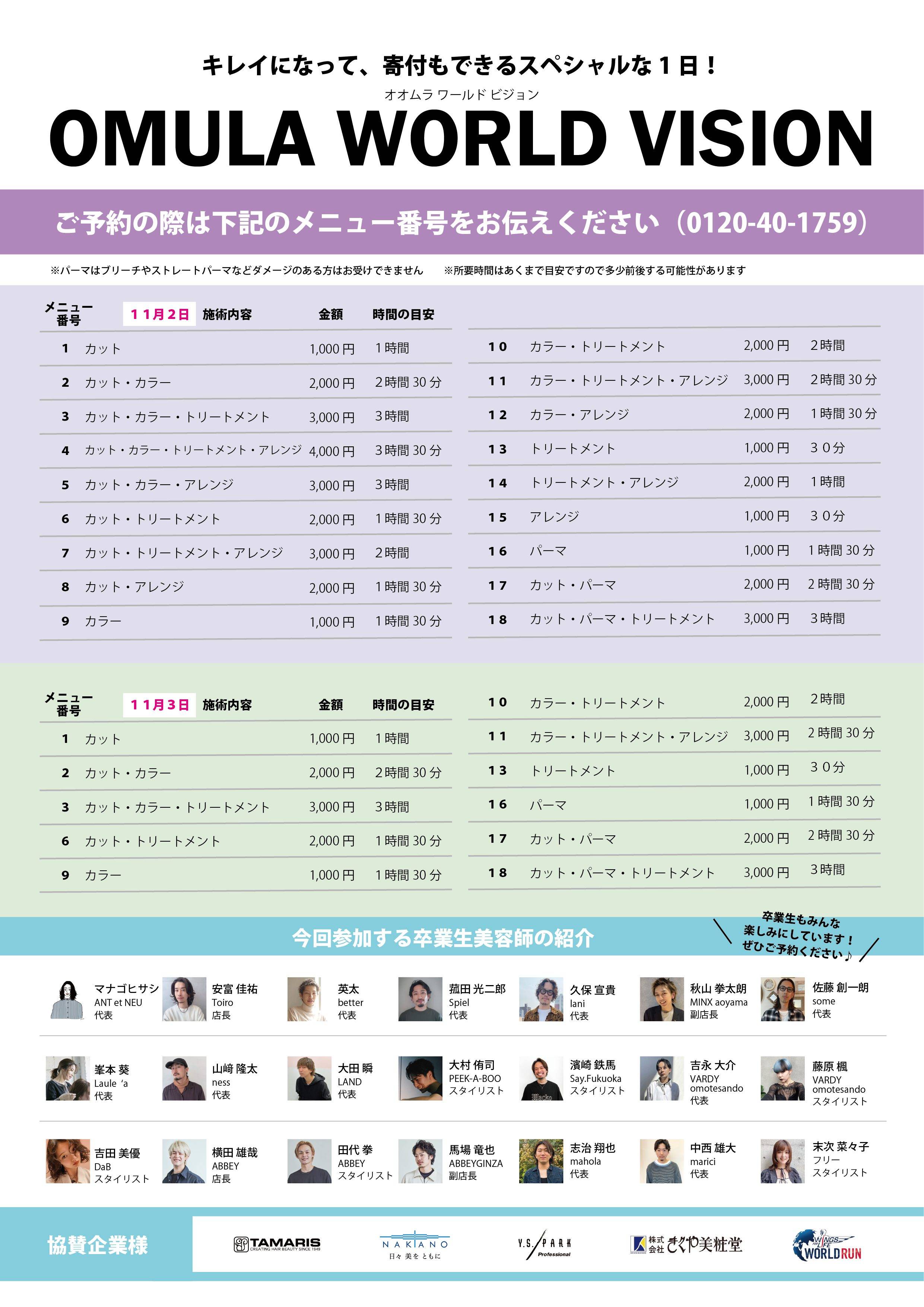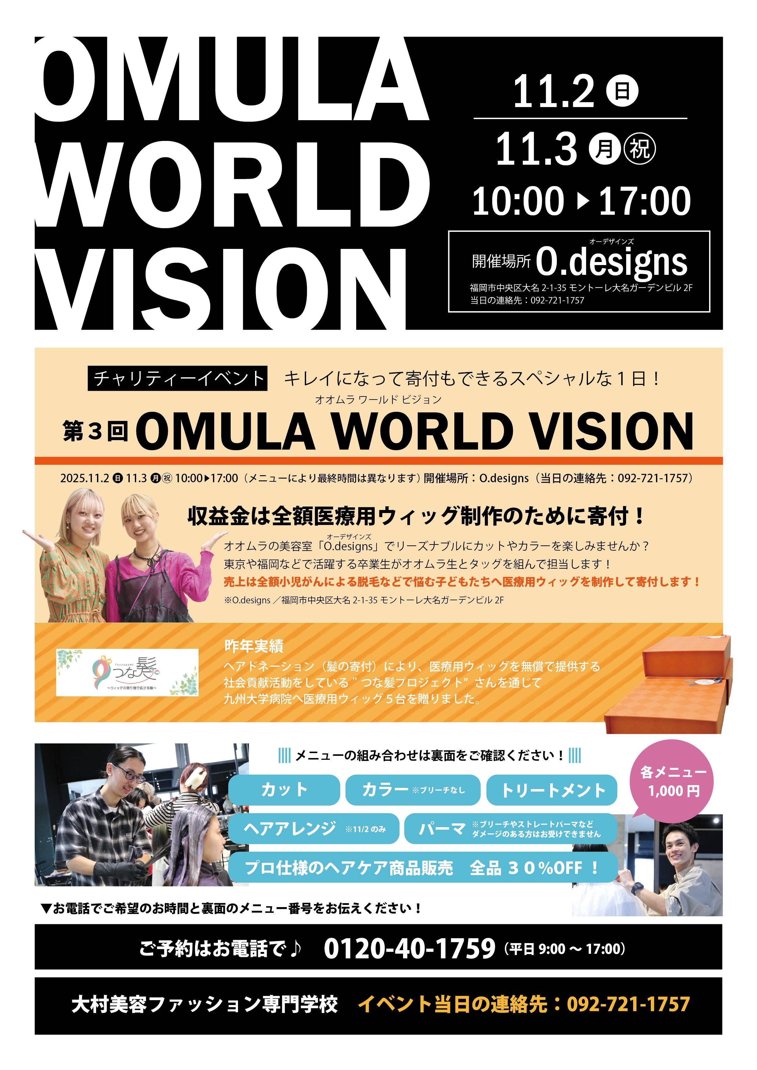2025年11月2日(日)・3日(月・祝)に、実習施設「O.designs」(福岡市中央区大名2-1-35 モントーレ大名ガーデンビル2F)にて、売上金を寄付するチャリティー美容イベント『OMULA WORLD VISION』を開催します!