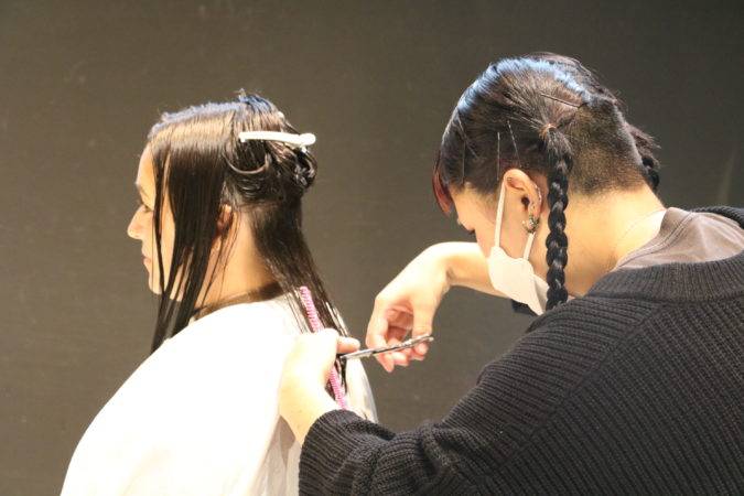 言葉が通じない問題は、翻訳アプリの使用や身振り手振りのジェスチャー、また通訳の方などで対応し、しっかりとコミュニケーションを取っています。希望のヘアスタイルの画像を提示いただいたりカラーチャートから色を選んでいただいたりと、教員のチェックも交えながらカウンセリングを行っています。