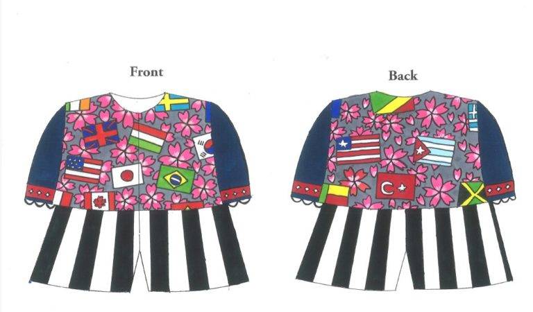 デザインについての学生コメント:「日本を桜で表し、国旗はたくさんの国の人たちと一緒に生きるイメージでデザインしました。カラフルなトップスを目立たせるため、ボトムスはシンプルにしました。最初は和柄の生地を使うことも考えましたが、立体感が欲しかったので桜をフェルトでひとつひとつ手作りしたのがポイントです。国旗はアイロンプリントでフェルトに貼りつけ、光沢感を出すためにラミネートしました。」(大村美容ファッション専門学校 ファッション科1年 吉田 奈那)